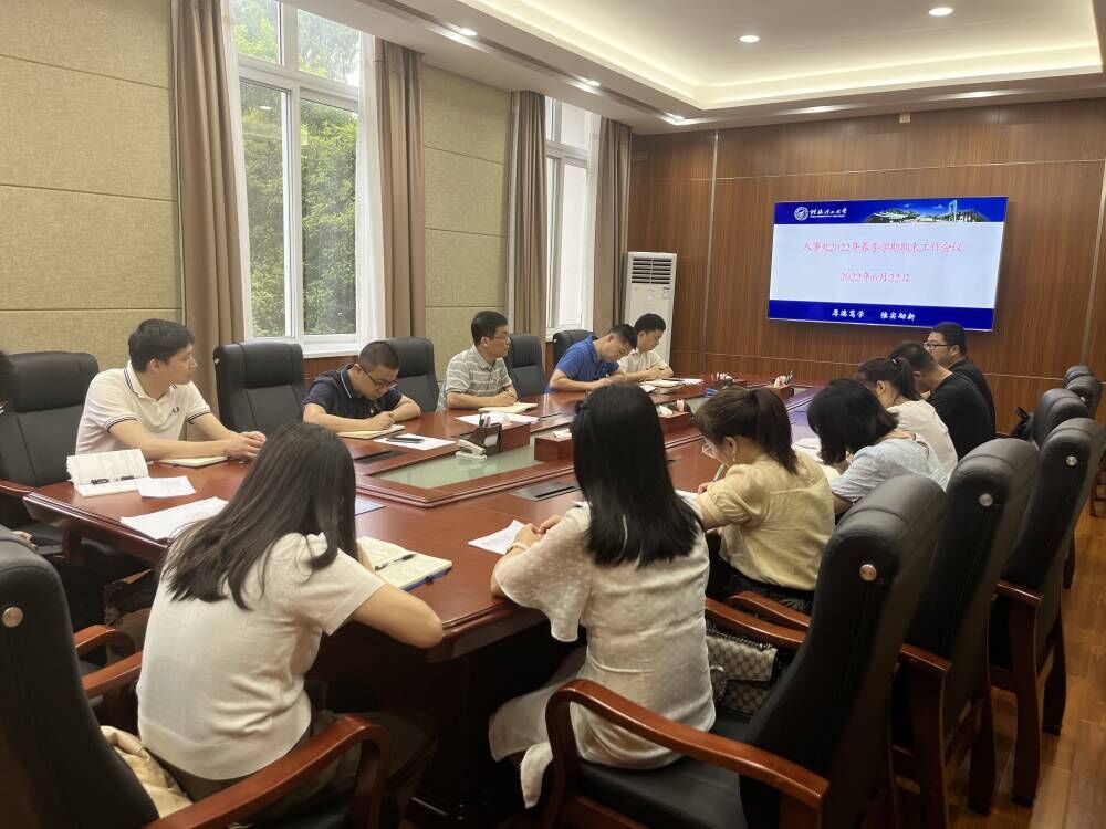 6月22日下午, 人事处召开2022年春季学期期末工作会议,对本学期部门工作进行总结交流,对暑期和下半年工作进行部署。人事处全体干部参加会议。会议由校长助理、人事处处长辛立章同志主持。