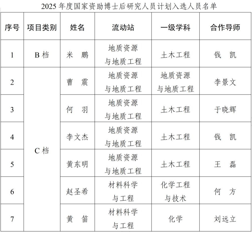 近日,中国博士后科学基金会公布了2025年度国家资助博士后研究人员计划(B档、C档)获选人员名单。我校7位博士后成功入选,其中B档1人,C档6人,为全区入选人数最多的高校。
