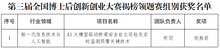 10月28日,第三届全国博士后创新创业大赛总决赛在泉州晋江圆满闭幕。我校地质资源与地质工程流动站博士后何羽(合作导师于晓辉教授)率领团队凭借《AI大模型驱动桥梁安全自主巡检及实时监测预警关键技术》项目,在“揭榜领题”赛道荣获优胜奖,实现我校在博士后全国赛事获奖方面的突破。